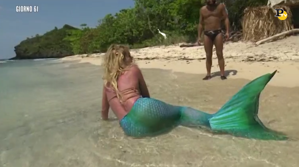 Lo spirito dell’Isola dei Famosi ha chiesto a Valeria Marini di superare una prova ricompensa. Ha dovuto indossare un vero e proprio costume da sirena e nuotare fino a un cilindro per recuperare il messaggio. Portata a termine la missione la Marini ha rivelato che si trattava di un pranzo abbondante per tutti.
