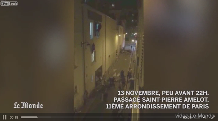 Ecco il video girato da un giornalista di Le Monde che si trovava per caso in un palazzo posto sul retro del Bataclan di Parigi, la sala da concerti presa d’assalto da diversi terroristi dell’Isis. Si odono spari urla, si vedono corpi morti per strada in un lago di sangue. Alcune persone cercano di salvarsi aggrappandosi fuori dalle finestre rischiando di precipitare nel vuoto.