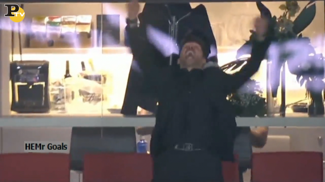 Diego Simeone ha festeggiato così al fischio finale della sfida del suo Atletico Madrid contro l’Arsenal che ha visto gli spagnoli vincere per 1-0 e qualificarsi per la finale di Europa League. Un’esultanza folla al termine di una gara combattuta ed emozionante fino all’ultimo e che il “Cholo” ha dovuto vivere in tribuna dato che era squalificato.