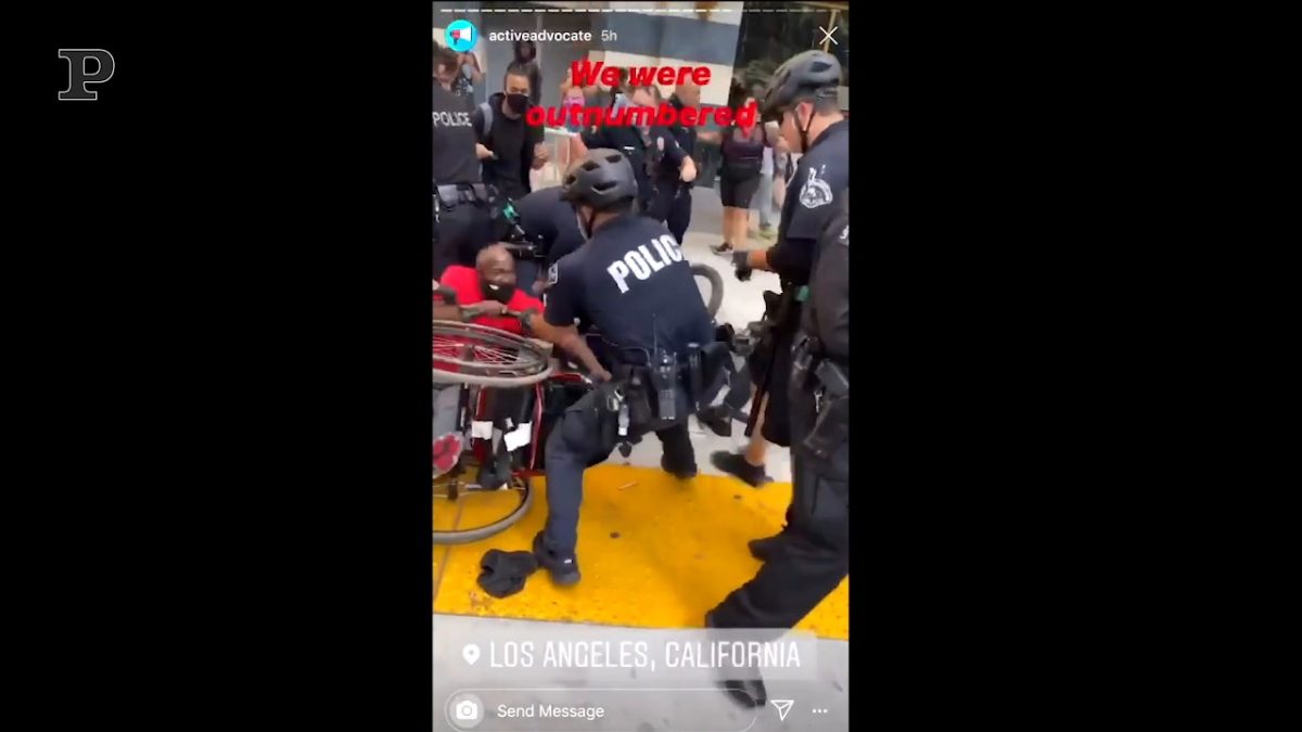 La polizia americana di nuovo al centro di polemiche: durante una protesta pacifica a Los Angeles alcuni agenti hanno fatto cadere un uomo disabile dalla sua sedia a rotelle e poi hanno distrutto la carrozzina. Il video che riprende l’accaduto è stato fatto circolare sui social media e ha ora migliaia di visualizzazioni.