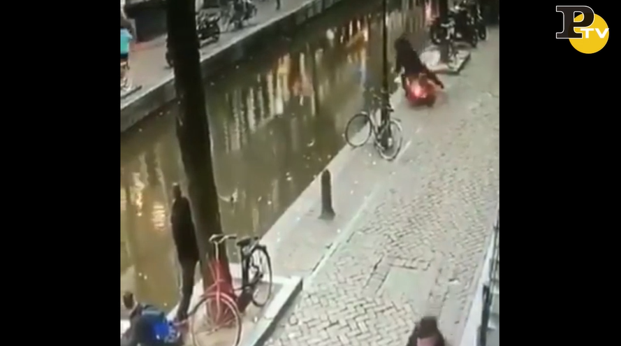 Non si può certo dire che quest’uomo sia il genio del parcheggio. Arriva bello spavaldo con la sua moto con tanto di manubrio altro, come un vero biker pronto a collezionare un’entrata in scena davvero plateale, ma l’unica cosa che riesce a rimediare è una figuraccia. Infatti arrivato forse troppo vicino alla banchina del canale, perde improvvisamente l’equilibrio mentre mette giù il cavalletto e in un attimo si ritrova fiondato nelle fredde acque Olandesi. Insomma, non troppo bene (Facebook:@Intrashtenimento)