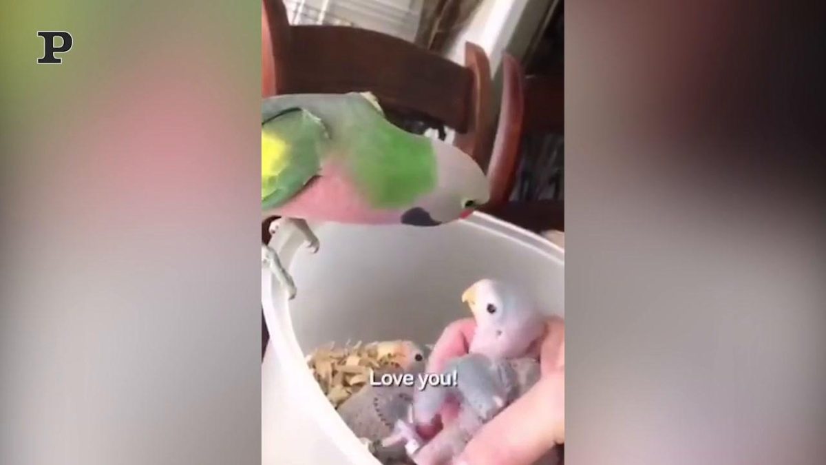 “I love you babies!”, si sente esclamare nel video. A parlare è proprio la mamma pappagallo, che mentre dà da mangiare ai suoi piccoli dice che gli deve nutrirli e che gli vuole bene. Li osserva attentamente e dà un bacino ad uno dei piccoli che il padrone tiene in mano. Una mamma davvero amorevole.