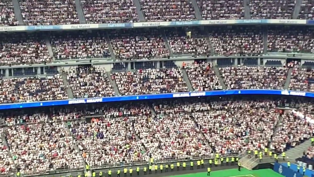Kilyan Mbappé si è presentato al Real Madrid in uno stadio Bernabeu sold out per una cerimonia durata una manciata di minuti. Oltre 80mila persone sono arrivate per salutarlo. Lui ha ascoltato le parole del presidente Florentino Perez prima di rivolgere il suo pensiero dal palco che era stato approntato al centro del campo. Un evento che ha ricordato la presentazione di Cristiano Ronaldo, anche lui accolto da uno stadio pieno (video tratto da X)