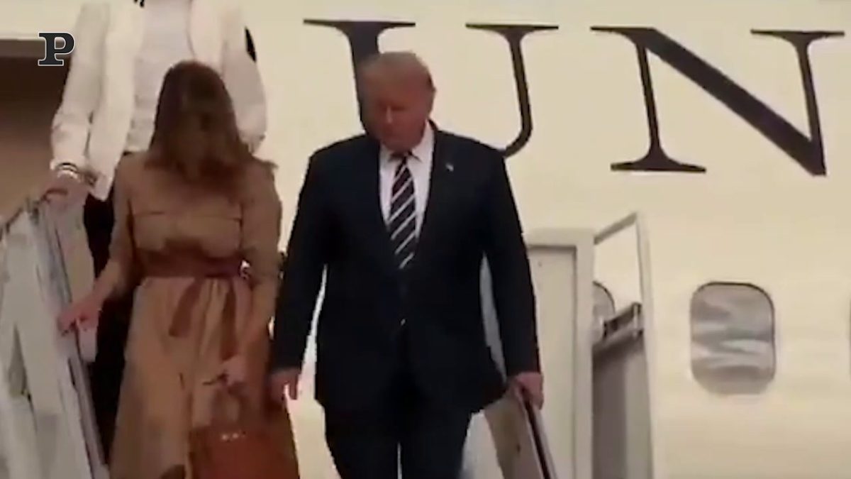 Mentre scende dall’aereo presidenziale in ritorno dal New Jersey, Melania Trump allontana la mano del marito Donald Trump, davanti alle telecamere della stampa.