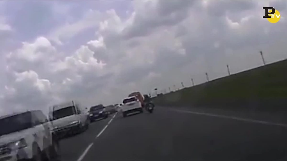 Questo motociclista è stato davvero molto fortunato. Una macchina proveniente dalla carreggiata opposta ha perso il controllo e, invadendo la corsia del motociclista, è andata a schiantarsi contro un’automobile. Il motociclista è uscito illeso e non è rimasto coinvolto nel grave incidente grazie all’automobile che, sorpassandolo proprio nel momento dello schianto, gli ha fatto da scudo salvandogli la vita.