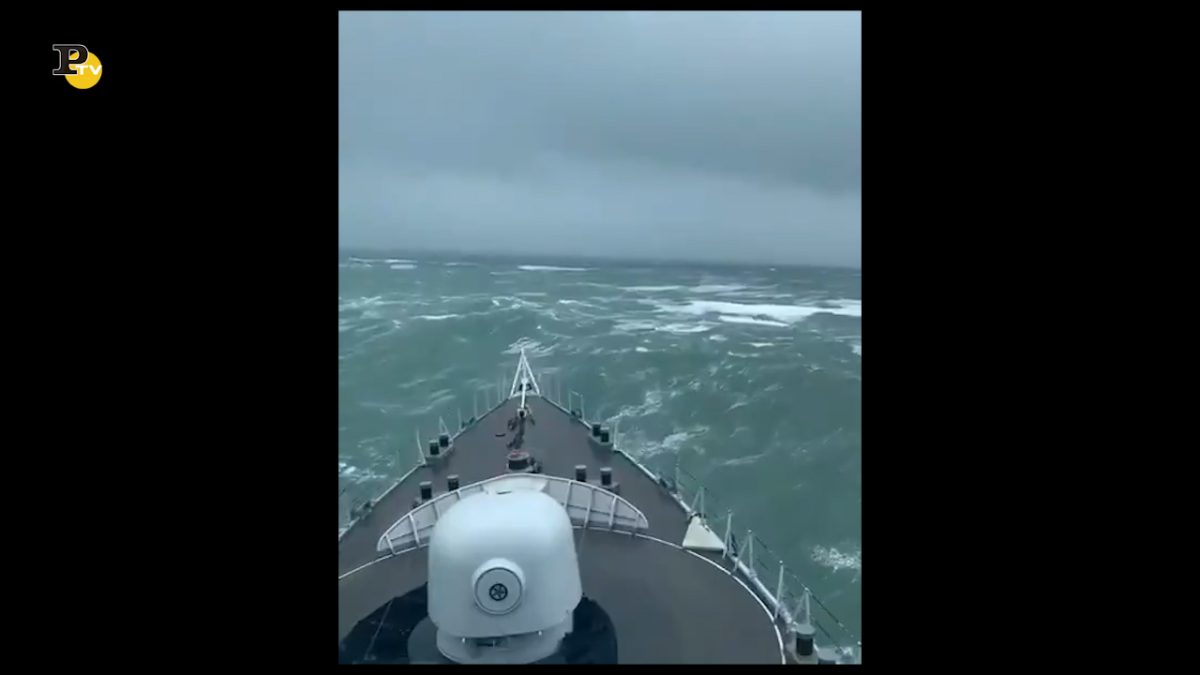 L’imbarcazione naviga nel mare in tempesta e dalla cabina di comando osservano la scena e tengono sotto controllo la condotta della nave. E a qualcuno scappa anche una risata nel momento in cui la prua affronta l’infrangersi delle enormi onde che finiscono per infrangersi a bordo della HNLMS Van Speijk della Marina dei Paesi Bassi.