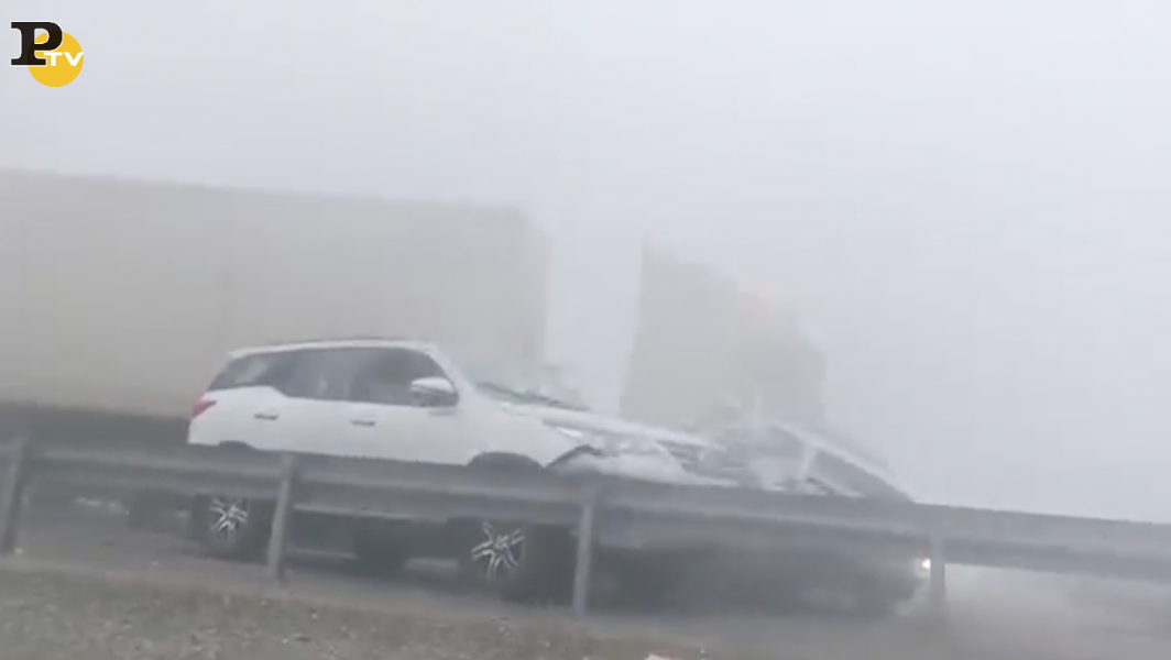 Questo video racconta il maxi incidente che ha coinvolto decine di automobili e tir che si sono trovati davanti un vero e proprio muro senza riuscire a capire e a vedere cosa ci fosse davanti.
