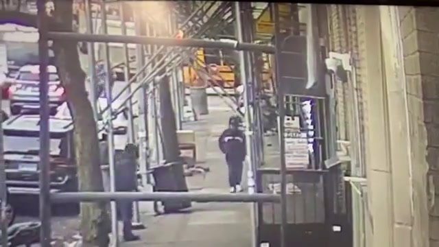 Il video delle telecamere di sicurezza mostra le persone scappare mentre i detriti iniziano a cadere sulla strada.