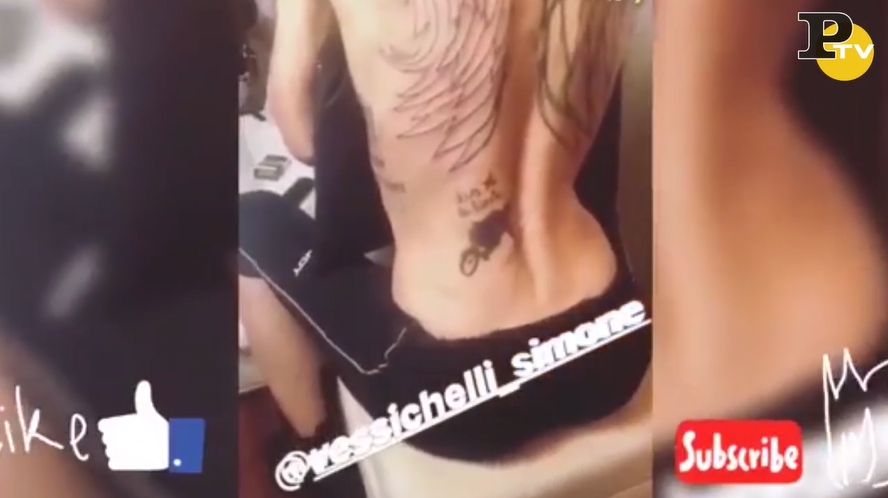 Nina Moric ha condiviso sulle sue stories di Instagram una nuova serie di tatuaggi. Nei video si vede il tatuatore Simone Vessichelli che le disegna sulla schiena delle grandi ed un uomo che cade dalla bici, con la scritta “Viva La libertà”. Evidente il riferimento di quest’ultimo tatuaggio a Fabrizio Corona.