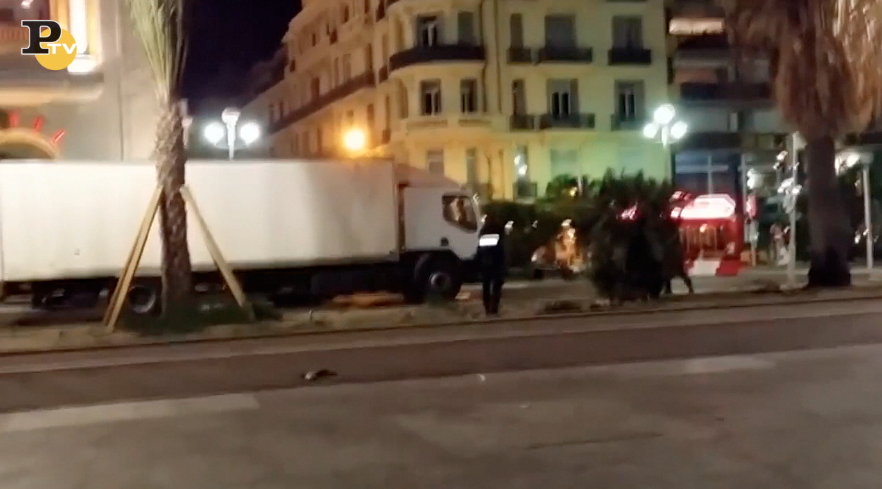 Nizza. Il video girato da un turista egiziano mostra la Polizia mentre spara diversi colpi di pistola ed uccide il terrorista che a bordo di un camion bianco ha appena compiuto la strage sulla Promenade des Anglais.