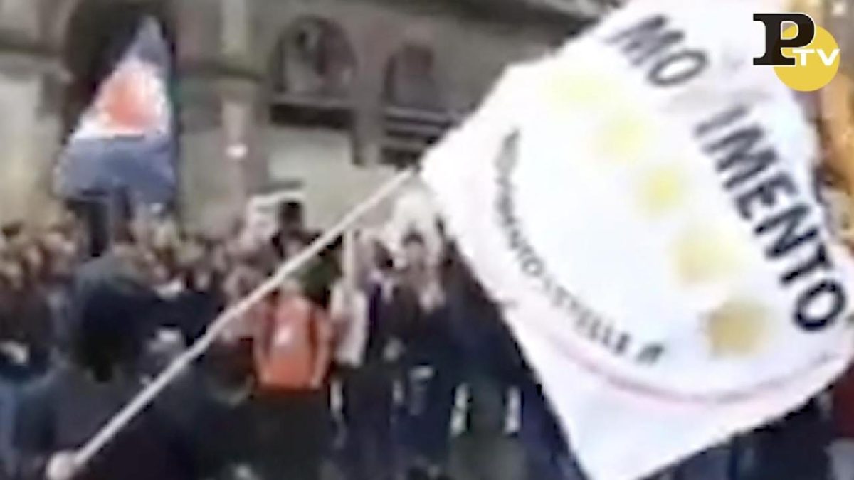 La bandiera della Lega e del Movimento 5 Stelle sono state bruciate in piazza Duomo, a Milano, durante il corteo “No Salvini day“. I contestatori hanno dato alle fiamme le bandiere urlando slogan contro i due partiti e i loro rappresentanti. Sono state lanciate uova sulle vetrine del negozio Zara e una ricevitoria in piazza Diaz è stata imbrattata con vernice (Twitter: @GiancarloDeRisi)