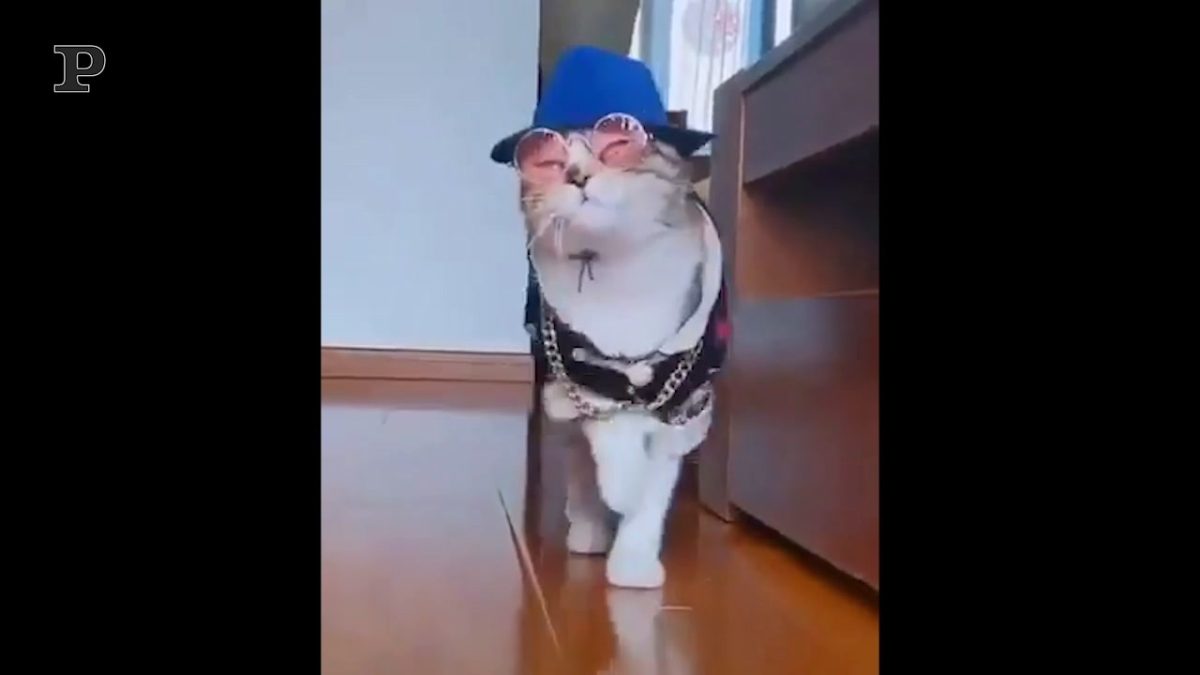 La buffa sfilata dal gatto super modaiolo vestito con cappello blu, occhiali rosa, vestito e collana d’oro da rapper. Il video è esilarante!