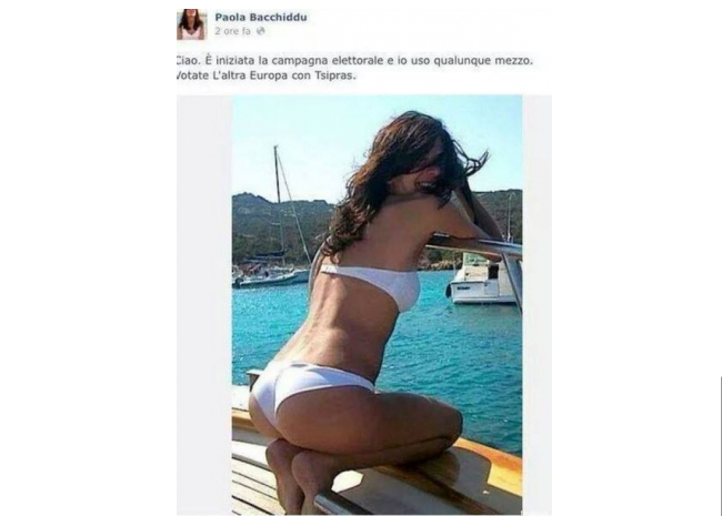 Le definizioni si sprecano. Osannata paladina dell’autoironia o demonizzata. Simpatizzanti solidali, più o meno denudati con tanto di selfie a dimostrarlo, o moralisti bacchettoni a detta altrui perché dissenzienti, nel polverone suscitato dalla foto in bikini della portavoce della Lista Tsipras per l’Europa, postata da lei stessa sulla sua pagina Facebook con le parole “È iniziata la campagna elettorale e io uso qualunque mezzo”, c’è dentro di tutto.
