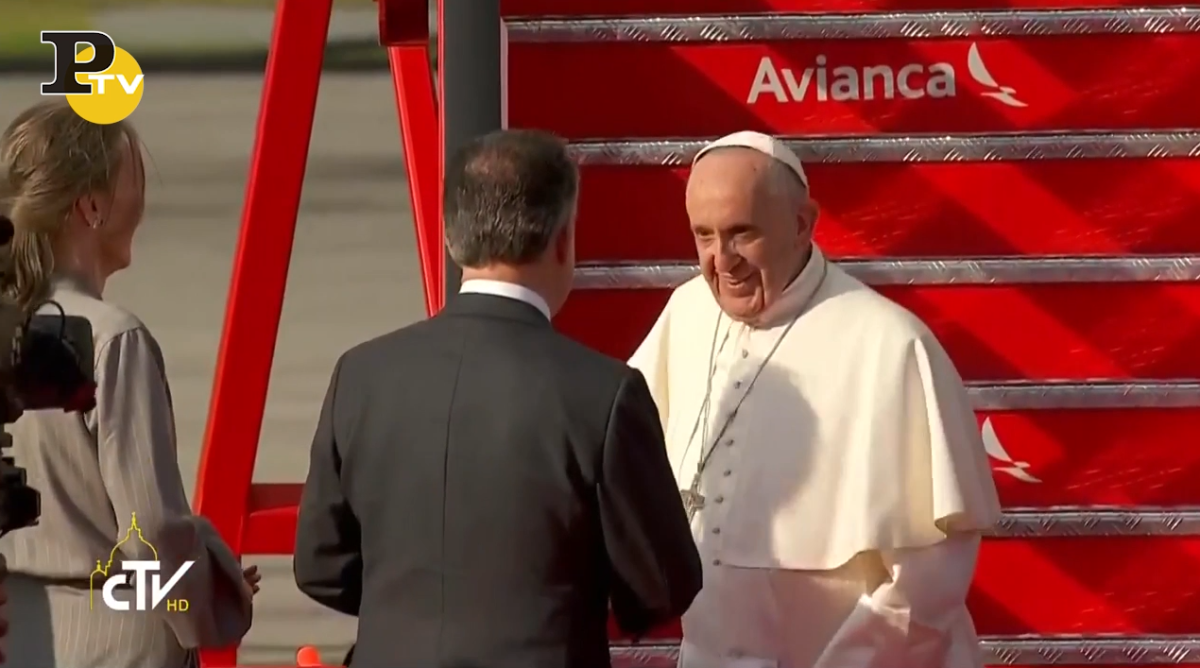 Papa Francesco atterra in Colombia accolto dal presidente della Colombia Juan Manuel Santos (Nobel per la Pace 2016). Qualche piccolo problema durante il volo a causa dell’uragano Irma che ha costretto l’airbus Alitalia a cambiare rotta.