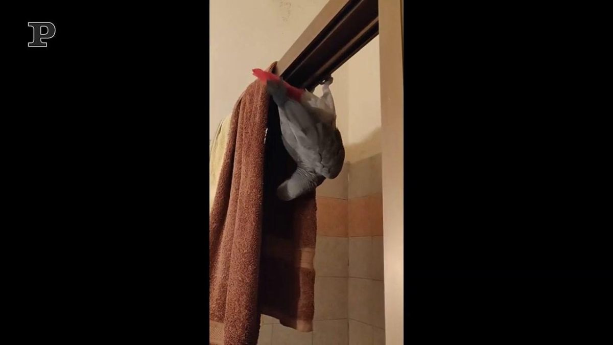 Questo pappagallino ha la stoffa da vero acrobata: agganciato all’asciugamano si lascia andare a delle buffe evoluzioni lungo la cabina doccia. Prima con un artiglio, poi con un altro il piccolo resta appeso a testa in giù per diversi secondi per poi ritornare al posto, felice e soddisfatto della sua esibizione.