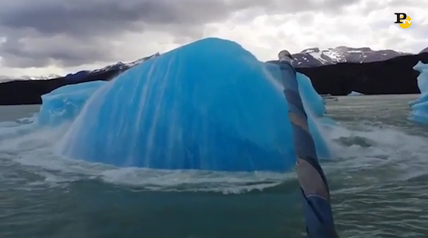 Dei turisti su una barca tra gli iceberg in Patagonia si sono trovati davanti ad uno spettacolo unico e ineguagliabile: un iceberg, che si è precedentemente rotto a metà, è emerso all’improvviso dall’acqua, a pochi metri dall’imbarcazione tra lo stupore e l’entusiasmo dei presenti.