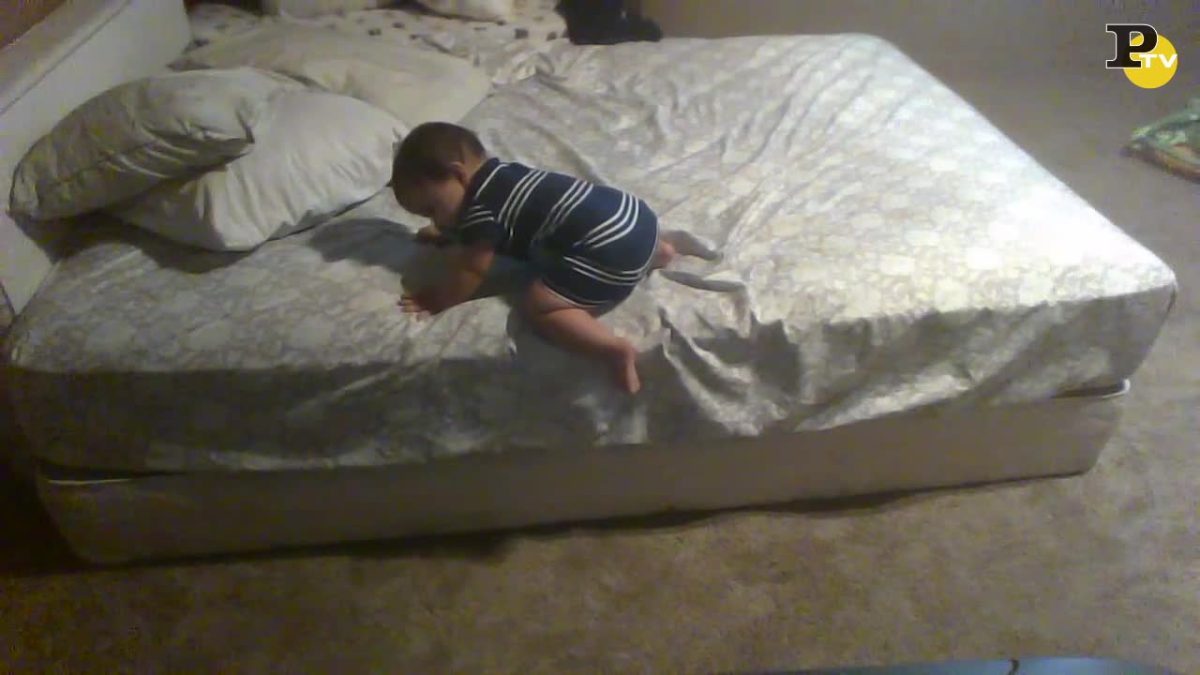 Questo bambino, stanco di stare a letto, cerca un modo per scenderne. Dopo essersi reso conto dell’altezza del suo ostacolo, escogita un piano infallibile per non farsi male, con ciò che ha a portata di mano: cuscini. Li poggia a terra uno sopra l’altro e il gioco è fatto; giù dal letto in tutta sicurezza.