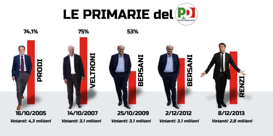 Da quel giorno seguirono le primarie del 2007, del 2009, del 2012 ed infine quelle del 2013 con la vittoria di Matteo Renzi. Dalla prima votazione all’ultima le primarie hanno perso un terzo dei suoi votanti, passati da 4,3 mln a 2,8 mln