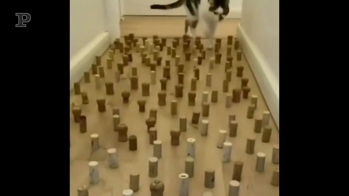 Basta una decina di tappi di bottiglia in un corridoio per ricreare un piccolo campo d’addestramento e togliersi il dubbio che micio di casa sia in realtà un agente segreto sotto copertura…