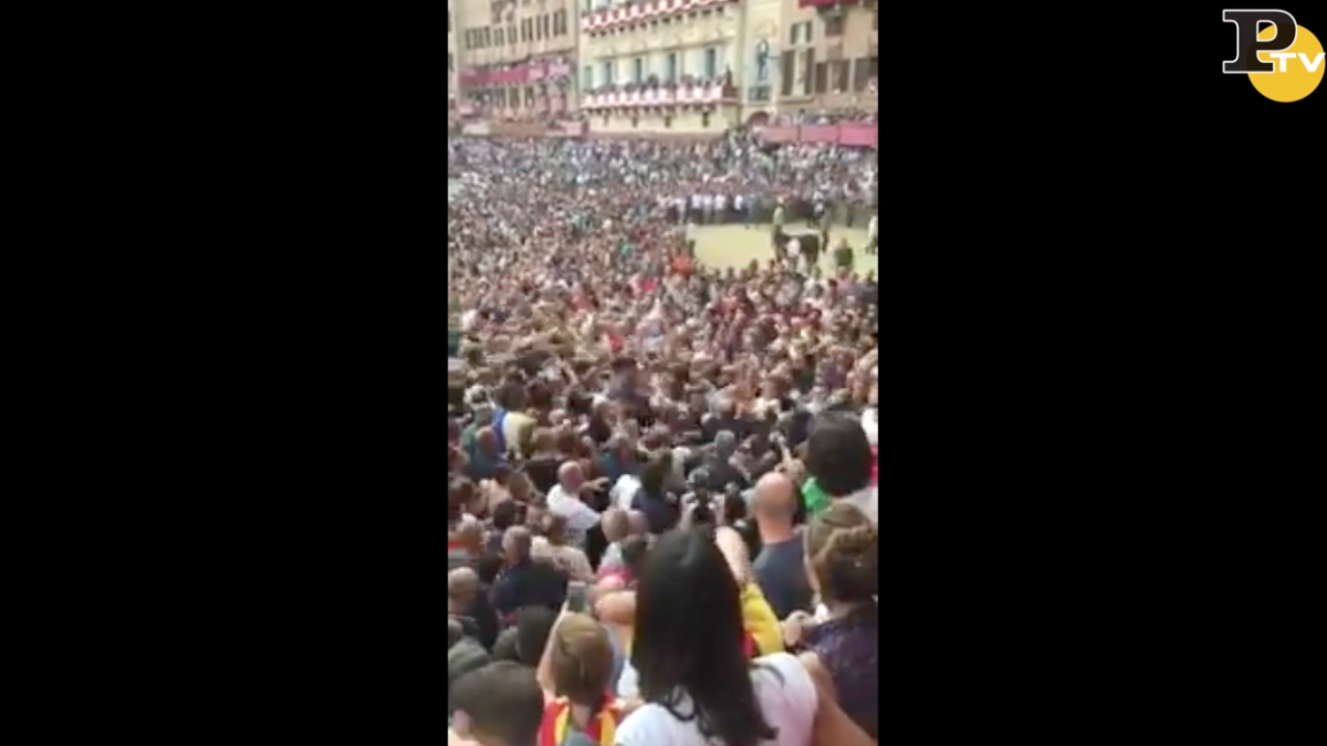 E’ finita con una gigantesca rissa il Palio di Siena svoltosi per il maltempo lunedì e non domenica. Dopo il successo della Selva con il cavallo Polonski condotto dal fantino Giovanni Atzeni, detto Tittia, si è scatenata una furibonda rissa tra le contrade di Nicchio, Montone, Onda e Torre. Un centinaio le persone che per diversi minuti sono andati avanti ad affrontarsi e picchiarsi proprio in Piazza del Campo senza che niente e nessuno li riportasse alla calma.