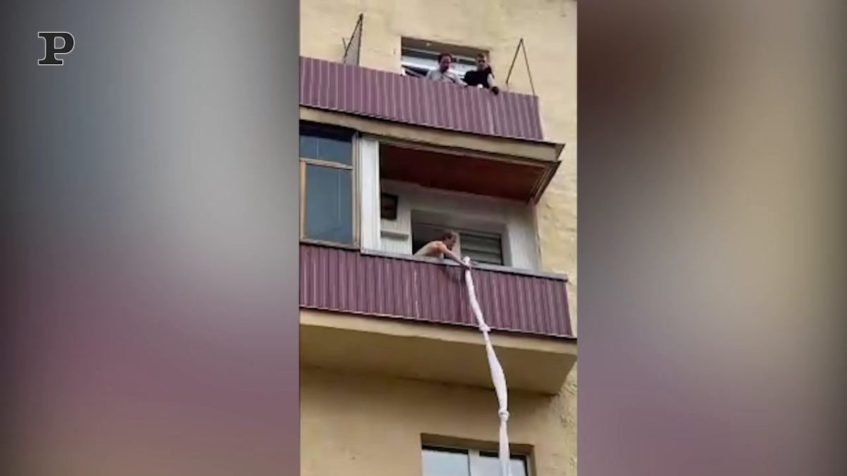 Beccato in flagrante. Nel video si vede un marito fuori di sè dalla rabbia, che cerca di acciuffare l’amante della moglie. Si sentono minacce e urla, tanto che il colpevole è costretto a scappare dal balcone aiutandosi con delle lenzuola. Viene addirittura picchiato dal vicino di casa del piano inferiore con una scopa! Un tonfo e cade a terra, pensando di essere in salvo. Ma ecco subito arrivare il marito, che lo rincorre per la piazza. Tutto ciò in mutande.