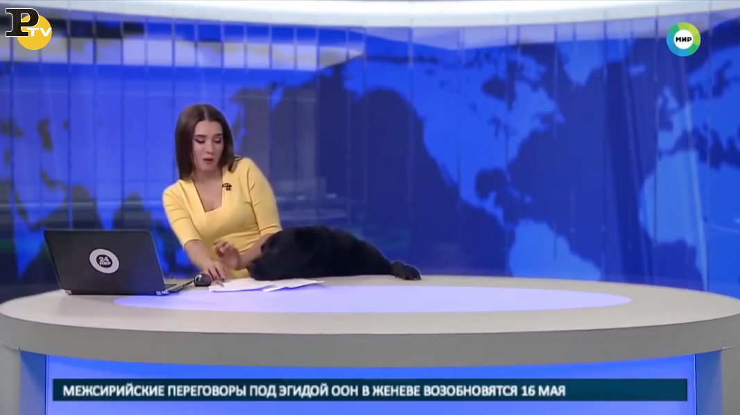 Attimi di panico per questa bella e brava conduttrice di Mir 24, emittente privata russa. Durante il notiziario che stava conducendo in diretta qualcosa infatti comincia a preoccupare la ragazza. Si capisce in pochi secondi che sotto il suo tavolo c’è un cane, nemmeno troppo tranquillo, che ha voglia di farsi vedere e diventare (a modo suo) una star.
