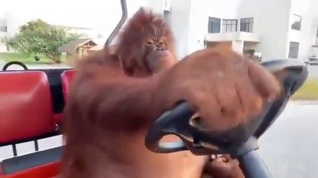 Un grosso esemplare di scimpanzé dal pelo rossiccio è posizionato al volante del veicolo e gironzola per il parco atteggiandosi come un vero guidatore amatoriale