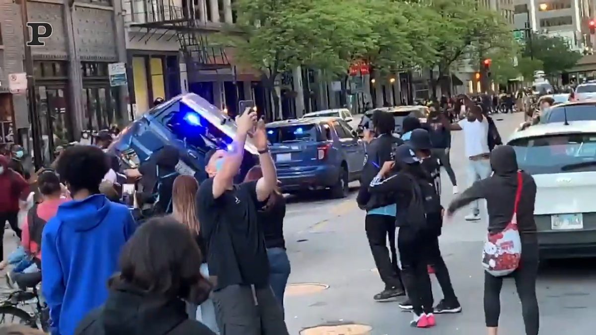 Un gruppo di manifestanti ribalta una macchina parcheggiata in una strada di Chicago, in Illinois. Da giorni, infatti, in tutta l’America continuano gli scontri e le proteste dopo la morte di George Floyd, l’afroamericano ucciso da un poliziotto a Minneapolis.