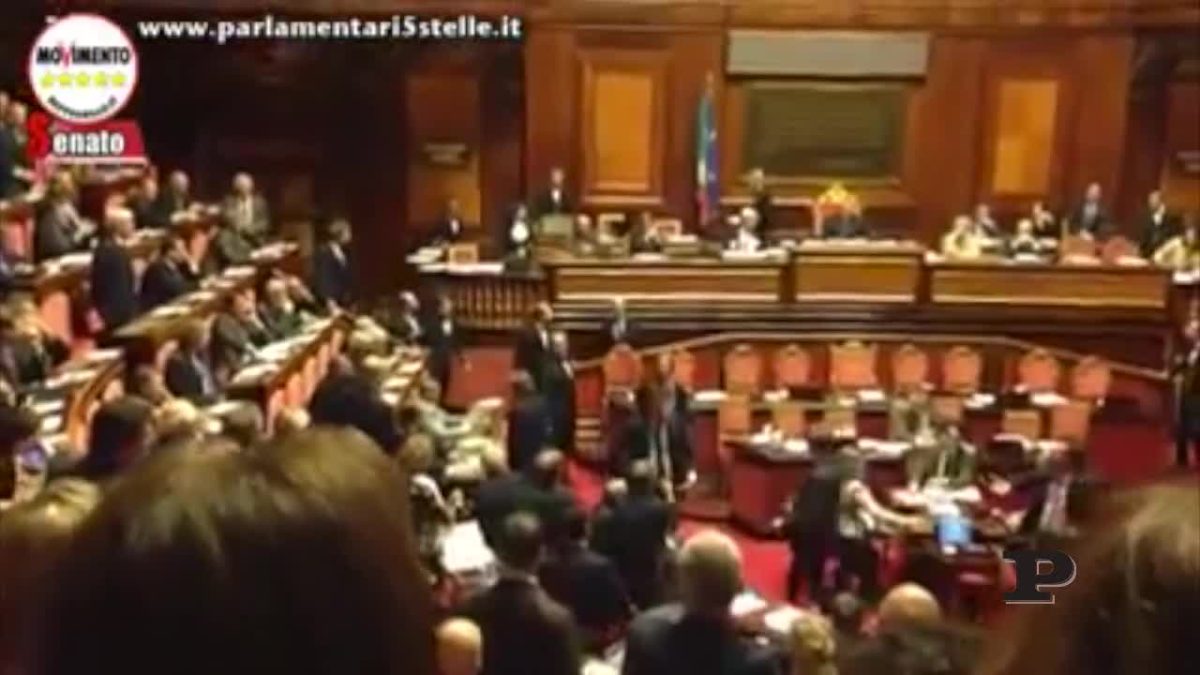 Quella per la fiducia sul Jobs Act è stata una giornata ad alta tensione al Senato. C’è stato uno schiaffo, diversi battibecchi, alcuni espulsi, tentativi di blocco dei lavori e persino un libro scagliato contro il presidente Piero Grasso. In un primo momento si era pensato ad un gesto di un senatore del Movimento 5 Stelle. I grillini però hanno diffuso questo video con il quale incolpano un altro senatore, della Lega Nord.