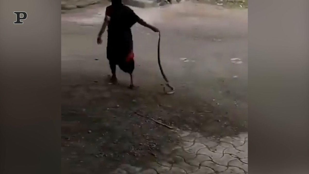 Memorabili commenti sotto il video che sta facendo il giro del web: “Adesso a nonna te ne vai in punizione… Laggiù!!” La signora trascina il serpente lontano da casa sua, proprio come se fosse un bambino che sta mettendo in punizione.