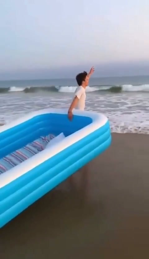 Un ragazzo gonfia un grande materassino a forma di piscina per farsi cullare dalle onde a largo del mare. Porta con sé un asciugamano e il MacBook portatile. Inutile dire che il mare non è stato docile nei suoi confronti.