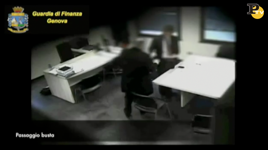 Ecco il video girato dalle telecamere della Guardia di Finanza che mostra il passaggio della bustarella contenente la tangente che un industriale ha versato per poter ottenere un’appalto in uno dei lavori tra le “Grandi Opere” del nostro paese, come quello per la linea ad Alta Velocità Milano-Genova.