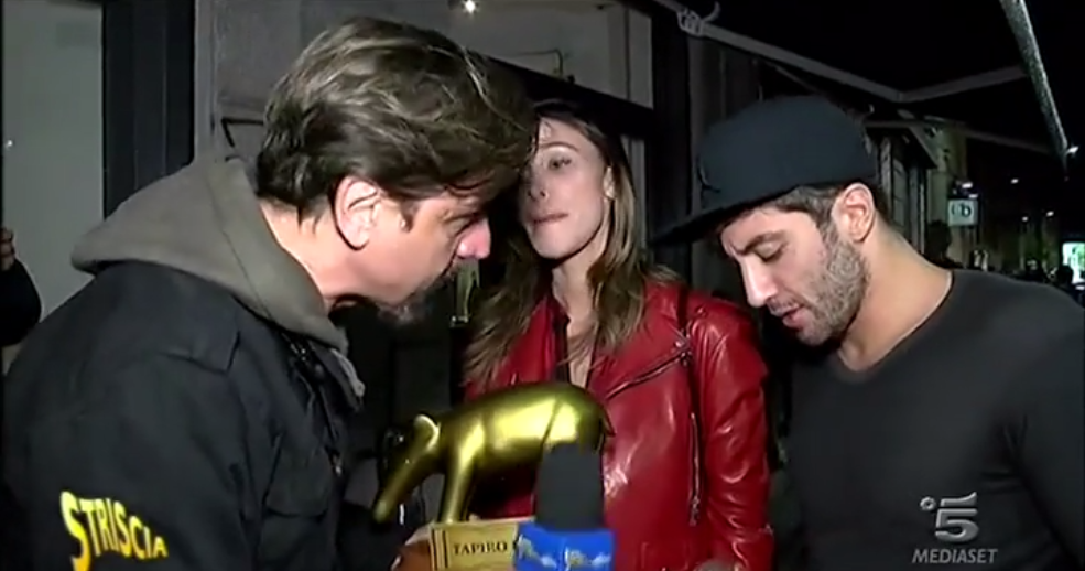 Valerio Staffelli consegna il Tapiro d’Oro a Belen Rodriguez e il compagno Andrea Iannone. Il primo Tapiro di coppia, l’ennesimo per Belen. I due si sono meritati il Tapiro a causa degli scatti sexy apparsi sui giornali nei giorni scorsi.