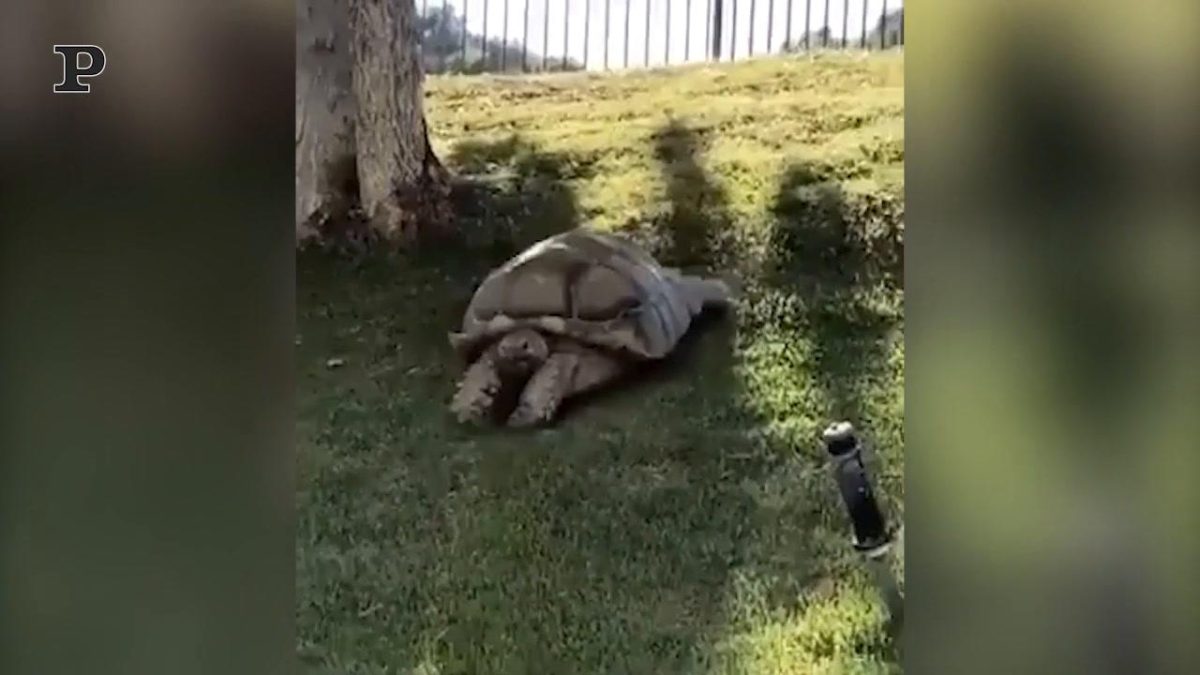 Chi l’ha detto che le tartarughe non amano giocare? Il filmato mostra questo dolcissimo esemplare alle prese con il gioco dello scivolo sul prato. Prima mette davanti la zampa sinistra, poi quella destra ed ecco che si lascia andare proprio come se fosse su uno scivolo. Che divertimento!