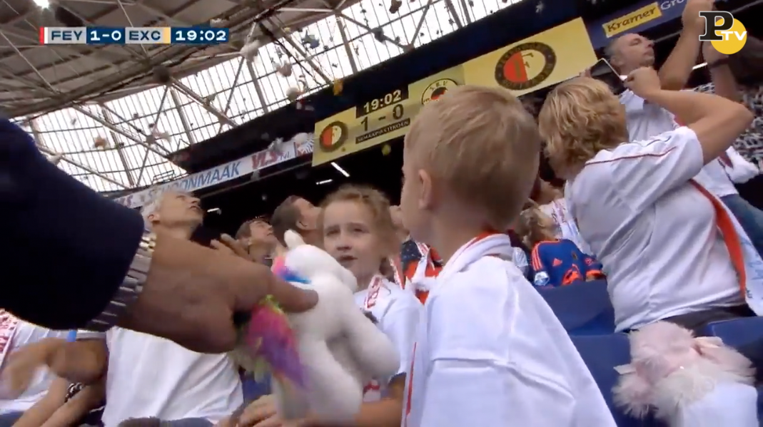 Una pioggia di peluche dalla curva degli ultras e diretta al settore sottostante, occupato da un centinaio di bambini che sono ricoverati presso uno degli ospedali della città di Rotterdam, il Sophia’s Children Hospital. E’ lo spettacolo fornito dai tifosi del Feyenoord avvenuto al 19′ della sfida del campionato olandese di calcio contro l’Excelsior.