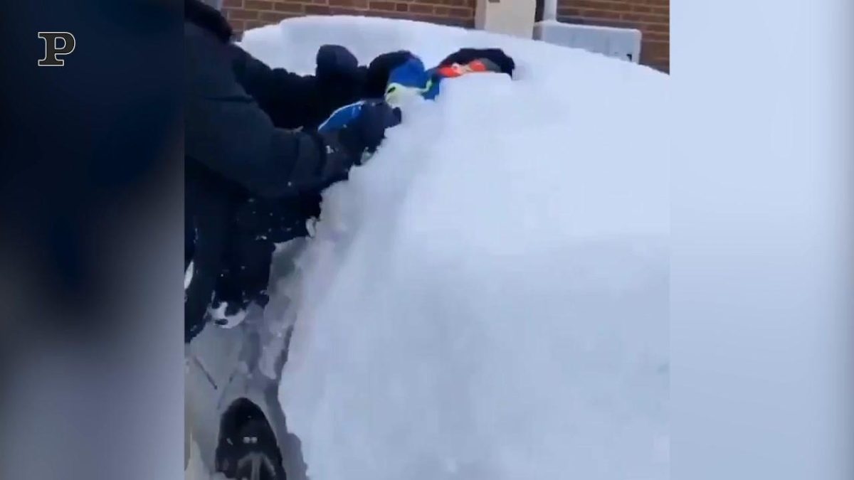 Questo papà utilizza il proprio figlio per spostare la neve dalla macchina