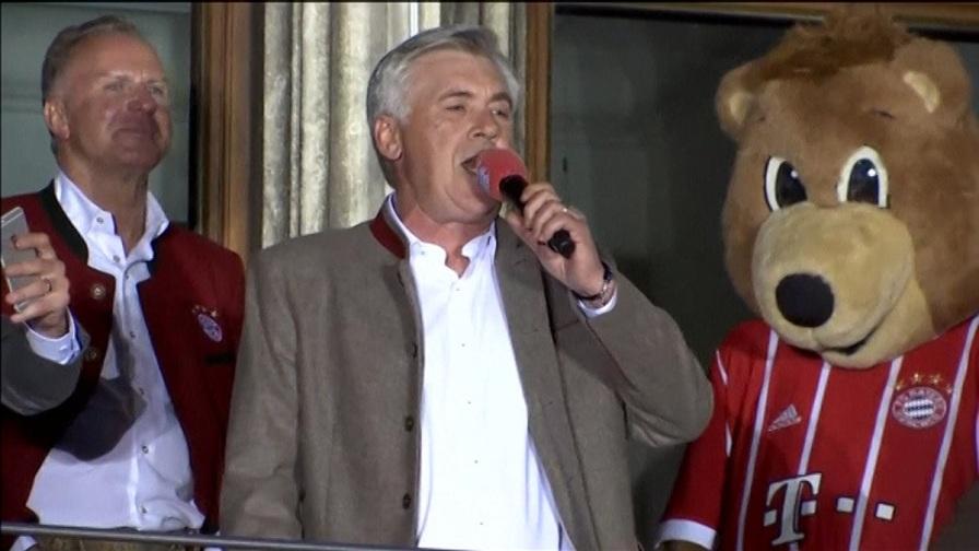 Davanti ad una gremita Marienplatz Carlo Ancelotti festeggia il trionfo del Bayern Monaco in Bundesliga