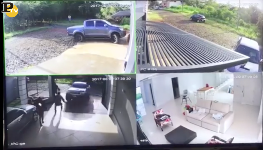 La reazione che non ti aspetti. Dall’Uruguay le immagini delle telecamere di sicurezza di una elegante villa a Ciudad del Este che riprendono due ladri all’interno dell’abitazione proprio nel momento in cui il proprietario con la figlia. Lei in motorino, lui con il pick up. Quando si alza la saracinesca automatica del garage ecco che i due malviventi si lanciano all’esterno per scappare verso la loro auto parcheggiata poco lontano.