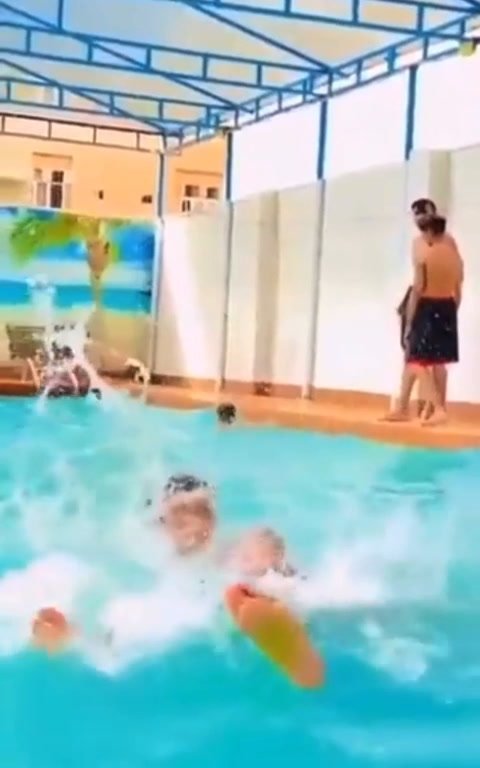 In piscina il figlio sale sulle spalle del padre per fare un tuffo in acqua ma non prende bene le misure e finisce proprio sulla testa del padre. Il video a rallentatore mostra bene lo scontro.