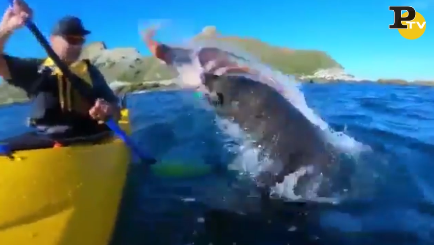 Mai disturbare una foca mentre questa si sta procurando il cibo. Spesso si pensa a questo animale come ad un essere tranquillo e divertente; lo immaginiamo giocherellare con una palla. Ma questa foca sa bene come difendersi quando viene disturbata. Questo esemplare infatti probabilmente è stato infastidito dalla presenza di alcuni turisti in kayak proprio mentre si stava procurando del cibo. Dopo aver catturato un polpo infatti, esce dall’acqua e lo usa per schiaffeggiare una delle persone che lo stanno disturbando. Mai avreste pensato ad utilizzare un polpo come arma ma in questo caso è un’efficace strumento per colpire in faccia l’intruso rematore. Questo rimane a metà fra lo stupito e il divertito. Certo deve avergli fatto male (Youtube)