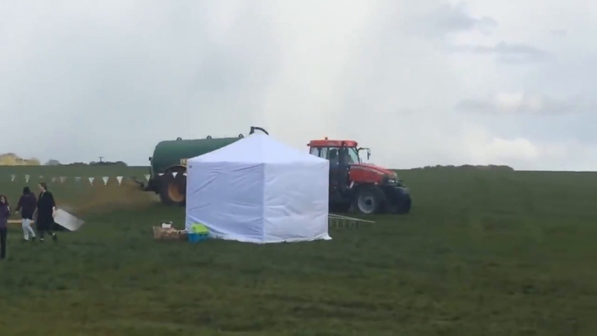 «Puzza che puzza» avrebbe detto qualcuno. E forse anche i partecipanti al rave che d’improvviso hanno visto comparire in lontananza un trattore con al seguito una tanica piena di… concime. E via di spruzzi in libertà, perché la festa insomma doveva finire. In un modo o nell’altro