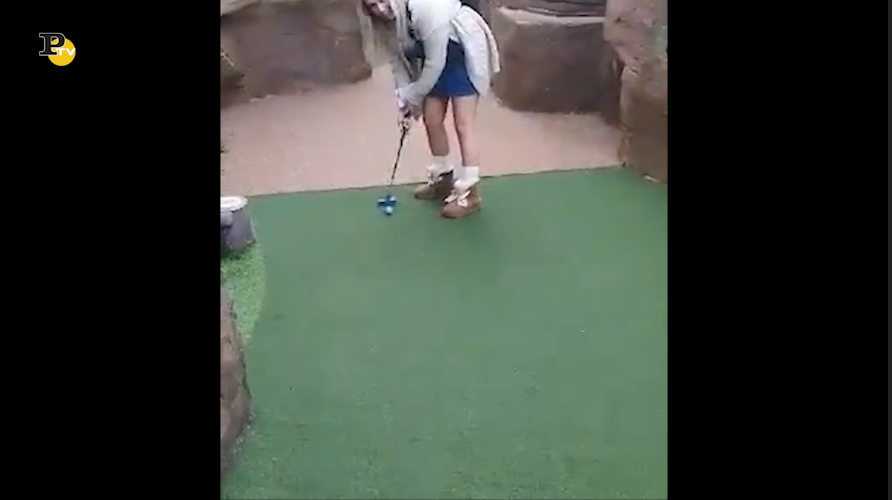 Questa ragazza sembra sia alle prime armi con il minigolf, eppure fa un tiro da vera campionessa. Lei stessa ne è stupita e divertita!