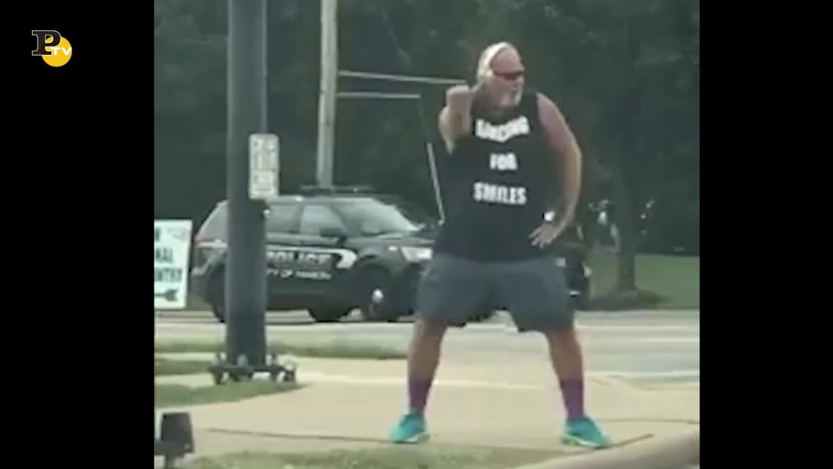 Che simpatico questo signore: balla per strada come se nessuno lo stesse guardando. Le movenze pop movimentano il suo ballo molto divertente.