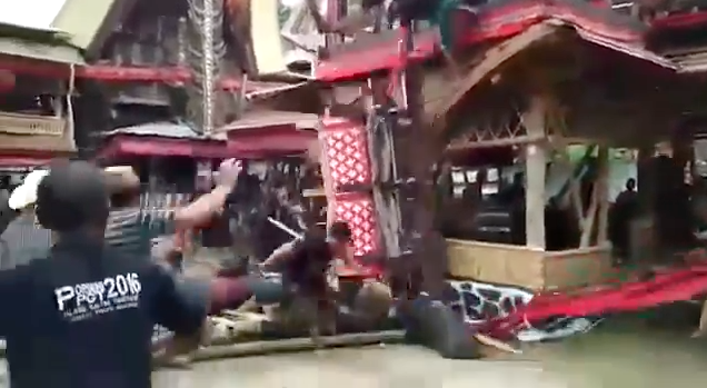 Indonesia. Questo video mostra quanto successo durante il funerale di una donna la cui bara stava per essere portata su di un altare. Lungo il tragitto però la scala ha ceduto e le persone che ci si trovavano sopra sono cadute a terra. Oltre alle persone anche la bara stessa è caduta, con un volo di circa 5 metri ed è finita, ironia del destino, addosso al figlio della vittima che è rimasto schiacciato.