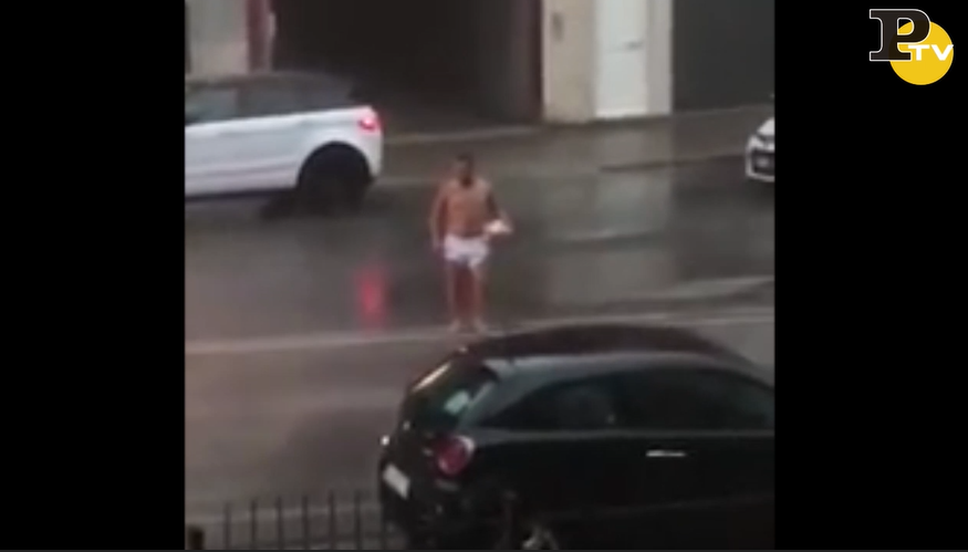 I veri appassionati di calcio hanno bisogno solo del pallone per essere felici. Questo ragazzo però ha preso troppo sul serio questo modo di dire. Si aggira per la strada in mutande con un pallone sotto il braccio. Tutto potrebbe sembrare accettabile, magari in spiaggia, magari d’estate, magari ad Agosto con 30 gradi. Ma quest’uomo si sposta e attraversa la strada completamente spaesato sotto il diluvio. Come minimo ne uscirà con un raffreddore (Youtube)