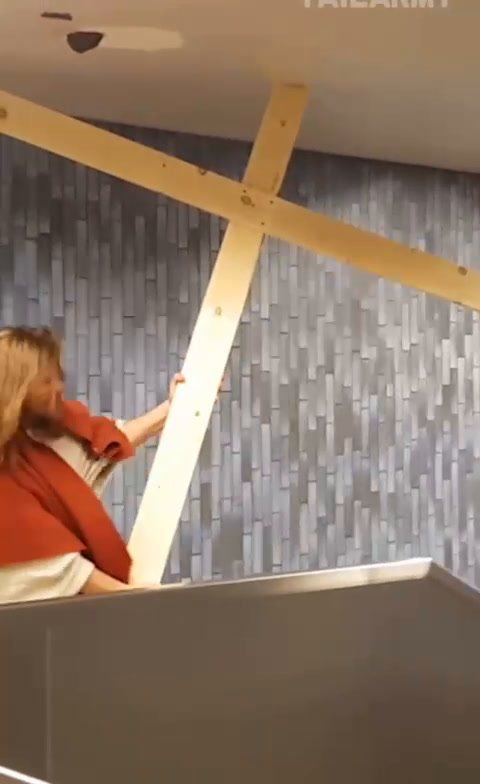 Un uomo che ha le sembianze di Gesù trasporta a mano sulle scale mobili un crocefisso di legno alto quasi 3 metri. Arrivato in cima alle scale mobili il crocefisso si incastra e buca il soffitto. Non sarà facilissimo schiodarlo da lì.